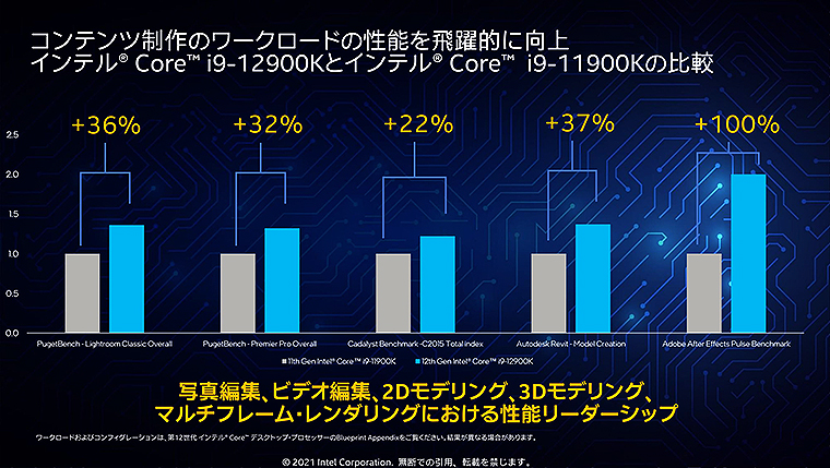 マルチスレッド性能の進化、P-coresの優れた応答性、DDR5の驚異的なデータ転送速度で、あらゆるタイプのコンテンツ制作でも、業界最高レベルの高速化を実現させている。その実績は次のとおり。