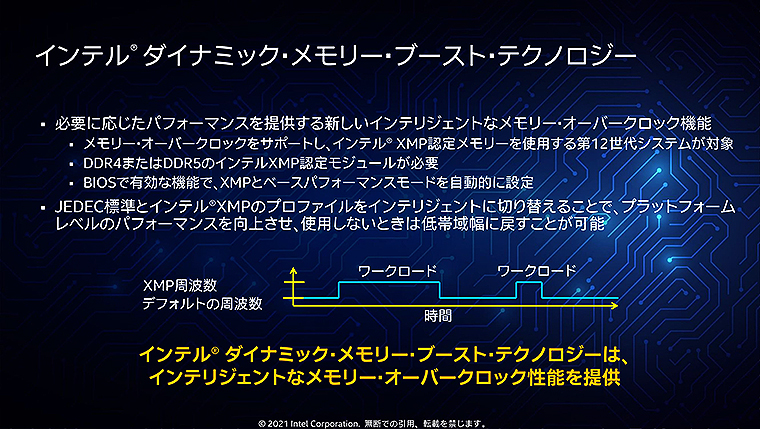 また、DDR5対応の最新版インテル エクストリーム・メモリー・プロファイル(インテル XMP).3.0(英語)も発表。これにより、書き換え可能なカスタムのプロファイルとメモリー・オーバークロックの柔軟なチューニングなど、追加のプロファイルを利用できるようになる。