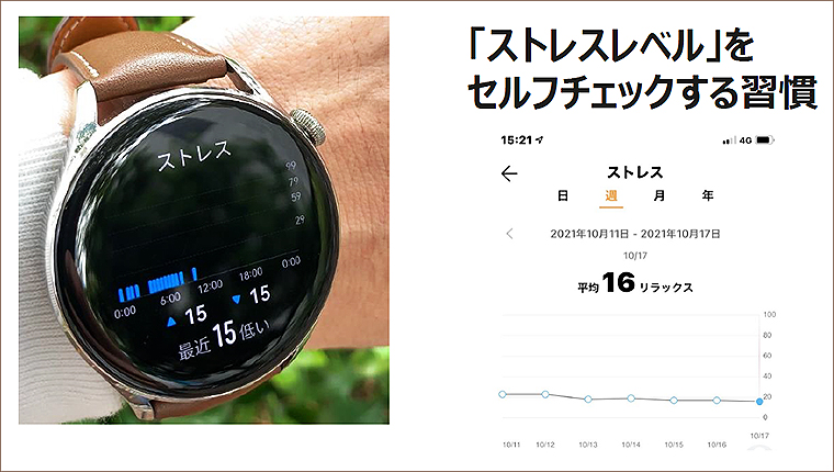 「次にストレスケア。オフィスのような無機質な空間から、自然な空間へ自分の身を移して、自分を取り戻す。HUAWEI WATCH 3 のストレスモニタリングをチェックしながら、3日1回は公園に行こう」