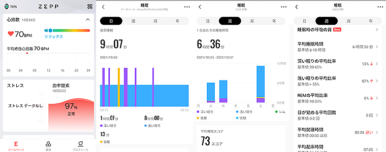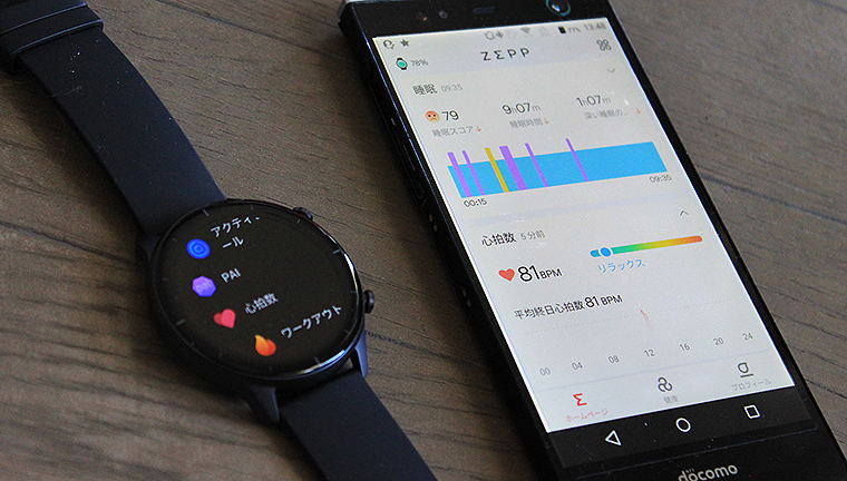 今回は、フル充電後、スマホ側のAmazfit 専用アプリ「Zepp」と毎日同期し、仕事時間もプライベート時間も、睡眠時も装着し、天気やワークアウト記録、GPSトラッキングなどを日常的に使用しても、2週間以上、充電なしで使えた。