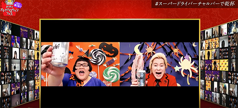 メイプル超合金 安藤なつ・カズレーザーの大声乾杯で火ぶたを切った「日本最大級!? おうちでオトナハロウィンフェス ASAHI SUPER DRY VIRTUAL BAR」。