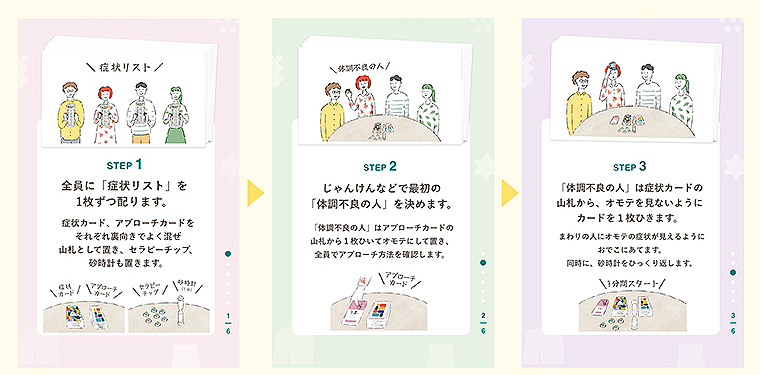 「人にやさしくなるゲーム」は、「体調不良の人」が「まわりの人」から声がけされる「セラピーワード」をヒントにして、自分の症状に気がつくことをめざすゲーム。ゲームは次のようなステップですすめていく。