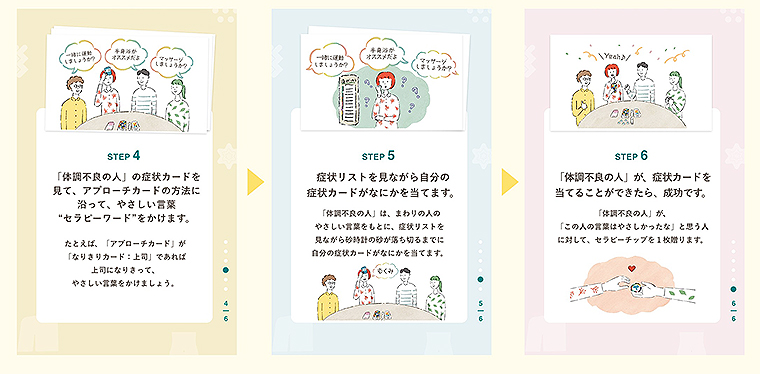 「まわりの人」は、「体調不良の人」の「症状カード」を見て、「アプローチカード」に書かれた方法で、「セラピーワード」をかけ、その症状に気づいてもらう。