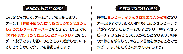 「体調不良の人」の役を交代しながらこれを繰り返します。ゲームはみんなで協力するパターンと、勝ち負けをつけるパターンがあるから、好みのルールで遊んでみて。