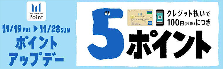 また、BLACK FRIDAY 期間後半の11月19日(金)~11月28日(日)には、三井ショッピングパークカード《セゾン》等対象のクレジット払いで通常100円(税抜)につき2ポイントのところ、100円(税抜)につき5ポイントとなるオトクなポイントアップデーを開催。