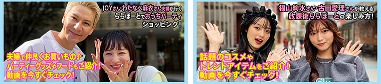 さらに、11月8日(月)からは、タレントのJOY・わたなべ麻衣 夫婦と、Popteenモデルの古田愛理・福山絢水が、それぞれ“おうちパーティ”“放課後ららぽーと”というテーマでショッピングを楽しむ限定ムービーが、ららぽーと・ラゾーナ・ダイバーシティ東京 プラザ オンラインショールーム「MEETS SHOP」で公開!