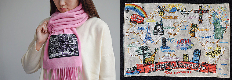 また、千秋が手掛けるストールは、生きているうちに行ってみたい世界のさまざまな場所が、ていねいな刺繍で表現されている。