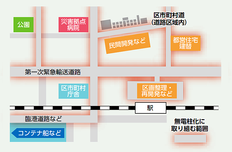 また、区市町村道や民間開発における無電柱化を強力にすすめ、面的に展開。