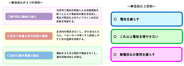 完全無電柱化にむけた「無電柱化の3つの目的」と「無電柱化3原則」