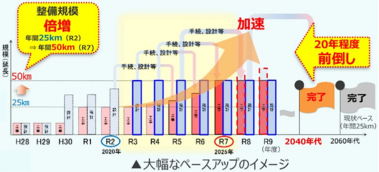 この目標のために、令和2年度が年間25kmの電線共同溝を整備したのを、令和7年度には年間50kmに倍増させるなど、年間当たりの整備規模を倍増し、大幅なペースアップを図る。