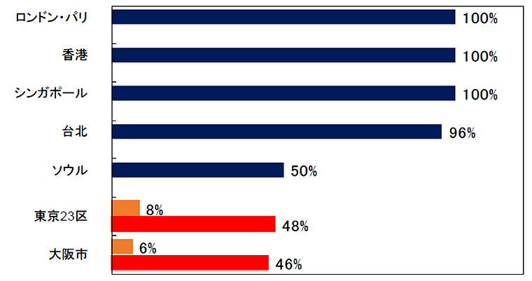 パリやロンドンは無電柱化率が100%を達成しているなか、都内全域で見れば、欧米の主要都市と比べ、依然として低い水準にある。