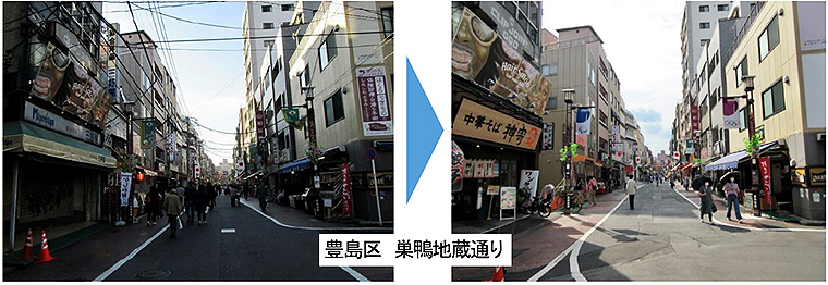 すっきりした景観になり、商店街の防災性も向上。景観のみならず、巣鴨などは、バギーなどとともに歩くシニアや、杖をつくシニアの安全性向上にもつながった。