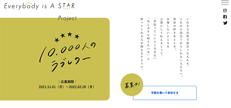 1万⼈のラブ☆レタープロジェクトは、井原市在住者や出⾝者、天⽂ファンなど井原に関係するあらゆる人たちから、井原市への想いや愛着をラブレター形式で募集。