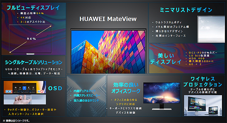 HUAWEI MateView のもうひとつの売りは、直感的な操作性と、スタイリッシュなデザイン、機能的なインタフェース配置。