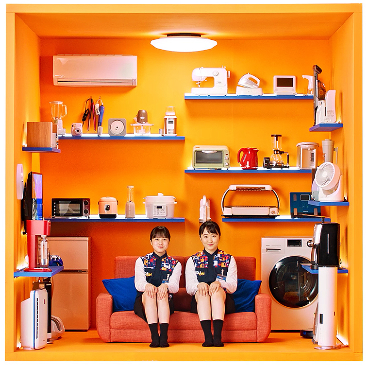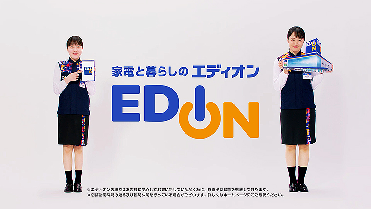 新CMでは、冒頭に EDION のロゴが記されたキューブが回転すると、家電が張り巡らされたセットとともに本田姉妹が登場。