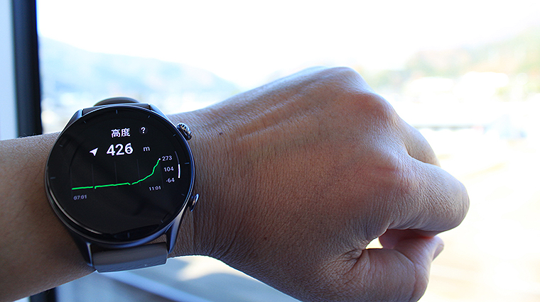 その高度測定がリアルタイムで動いていくので、車窓を楽しみたいのに、「Amazfit GTR 3 もずっとみていたい」という新しいジレンマを覚えてしまう。
