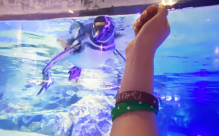 しかもこの「推しペン カラーバンド」、飼育スタッフも身につけているから、「スイカくん推しなんですか? わたしはおもち推しです!」と、すみペンファン同士、飼育スタッフとも会話が弾む……はず(笑)。画像↑↑↑のように、推しペンの近くで、おそろいの写真を撮るのもおすすめ!