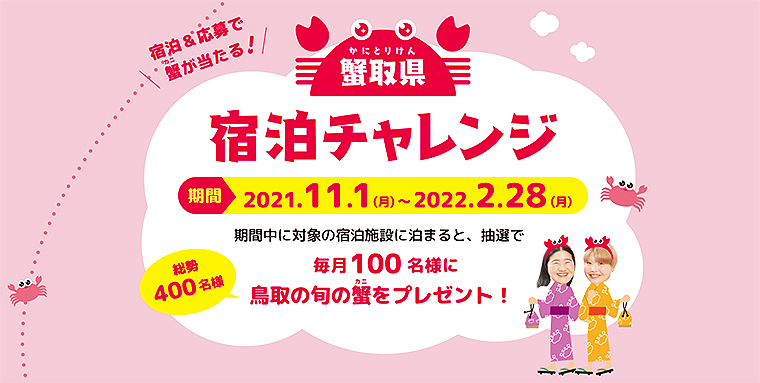 期間中、県内の対象宿泊施設(157施設)に宿泊し、WEBまたは専用はがきで応募すると、「松葉がに」が毎月抽選で100名、総計400名に当たる!