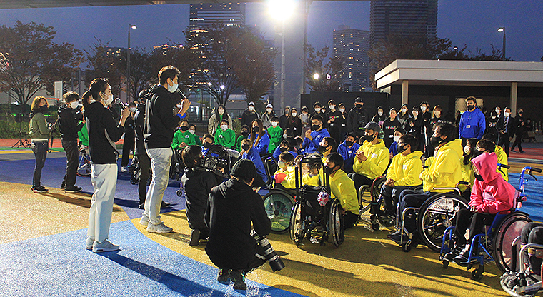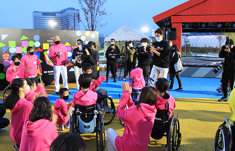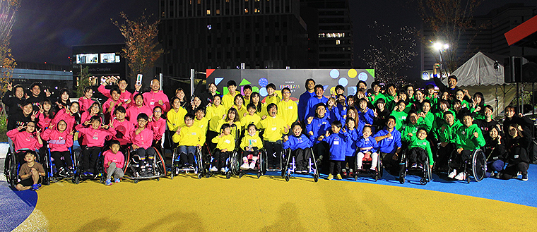 冷たい小雨が降るなか、東京・豊洲の TOKYO SPORT PLAYGROUND は、車いすの人も、杖をつく人も、別け隔て関係なく、みんなではしゃいで大盛りあがり。日が暮れるまで熱かった!
