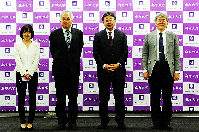 左から、麻布大学 坂西梓里 特任助教、同 村山史世 准教授、同 川上泰 学長、村上賢 副学長・獣医学部長。