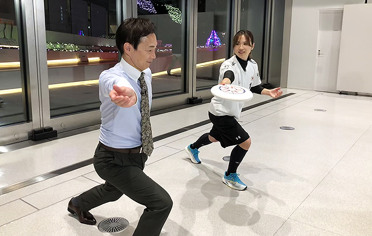 植木通彦と対面した田村友絵は、はまだ広く認知されていないアルティメットの楽しみ方や魅力を、詳しく紹介。
