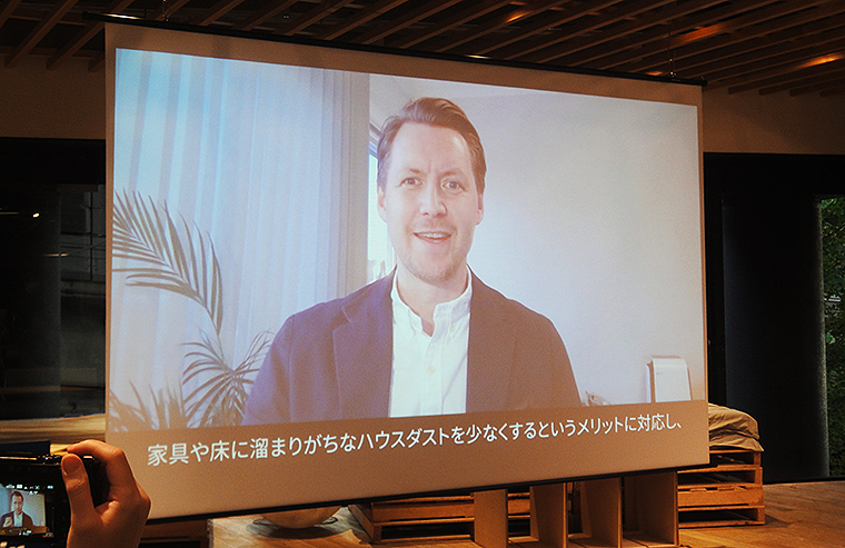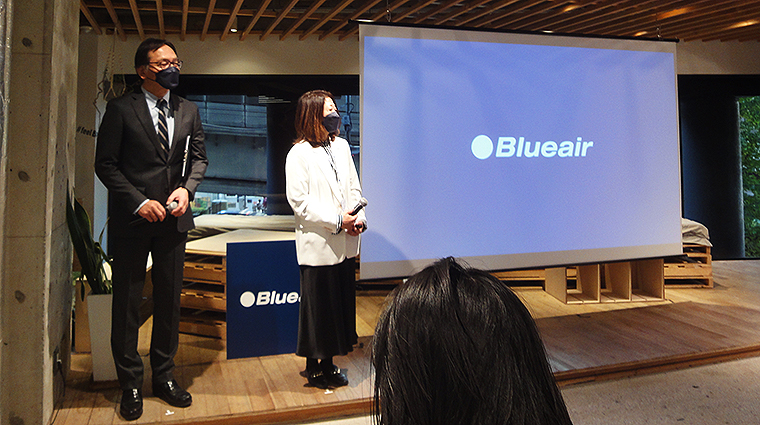 東京都内で12月9日に開いた「Blueair DustMagnetTM」発表会では、セールス・オンデマンド 室崎肇 代表取締役社長、同社 新井加奈子 製品担当が登壇。ビデオプレゼンではブルーエア ヨナス・ホルストCPO が登場した。