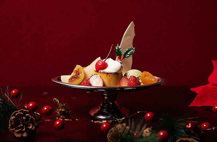 いちごや金柑、レッドキウイフルーツなど色とりどりのフルーツに、クリスマスツリーカラーのピスタチオアイスクリームをのせたクリスマス期間限定のプリンアラモード。