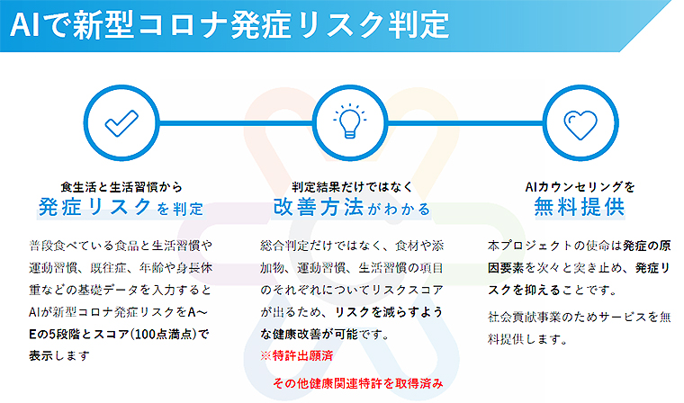 サービス名のとおり、「将来、新型コロナウイルスに感染・発症するリスクを判定する」という世界初のスマホサービスで、利用は無料。新型コロナの変異株や新たなパンデミックに備えるための解決策を提案する、社会貢献プロジェクトのひとつ。