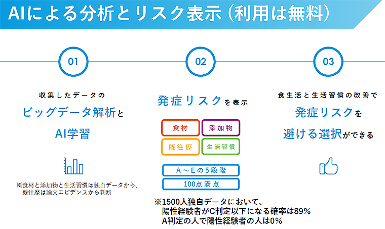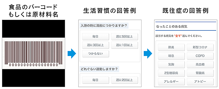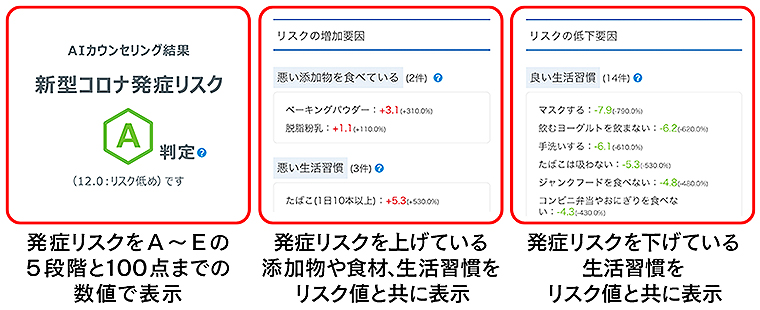 具体的には、食品のバーコードや原材料名をAIが読み取り、生活習慣やこれまでになったことのある病気や症状を回答すると、AIが新型コロナを将来発症するリスクをA~Eの5段階で表示。