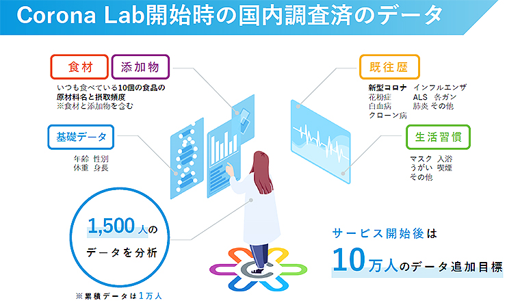 この「Corona Lab」(コロナラボ)は、いつも食べている食品に含まれる食材や添加物、運動や喫煙などの生活習慣、既往症などによって上下する発症リスクをAIが分析・判定し、新型コロナを将来発症するリスクを判定できる。