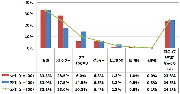 また、女性が自信のないところは「スタイル」、 次いで「胸」という結果に。理想の体型の芸能人については、女性は「菜々緒」、男性は「綾瀬はるか」が1位に入った。