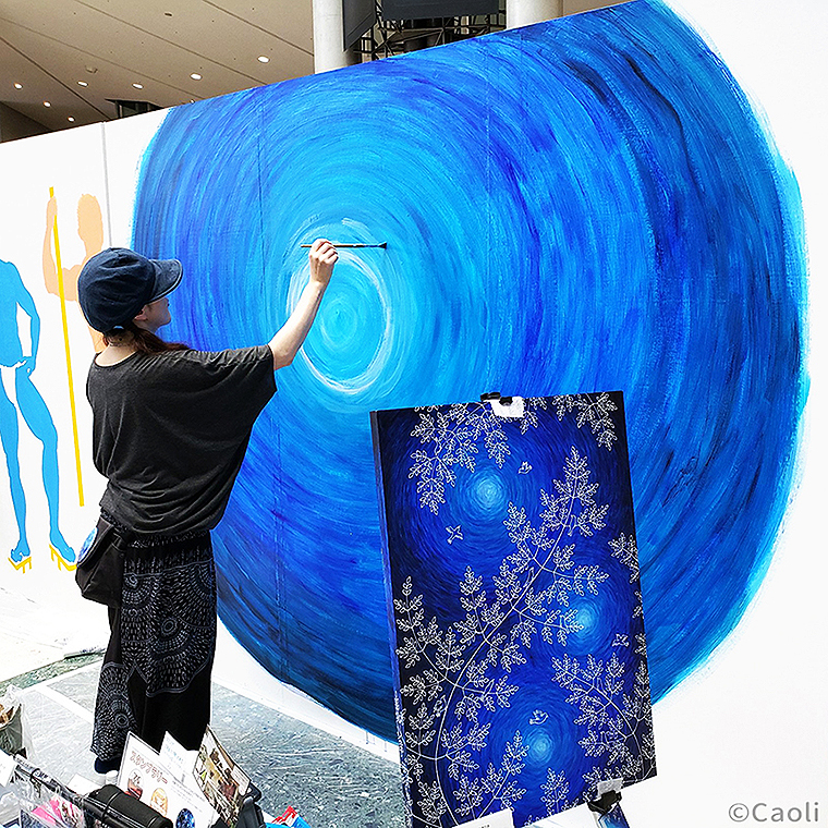 Caoli は、青いキャンバスに広がる白い森が印象的。同フェスの2日間をかけてライブペイントをみせてくれる。