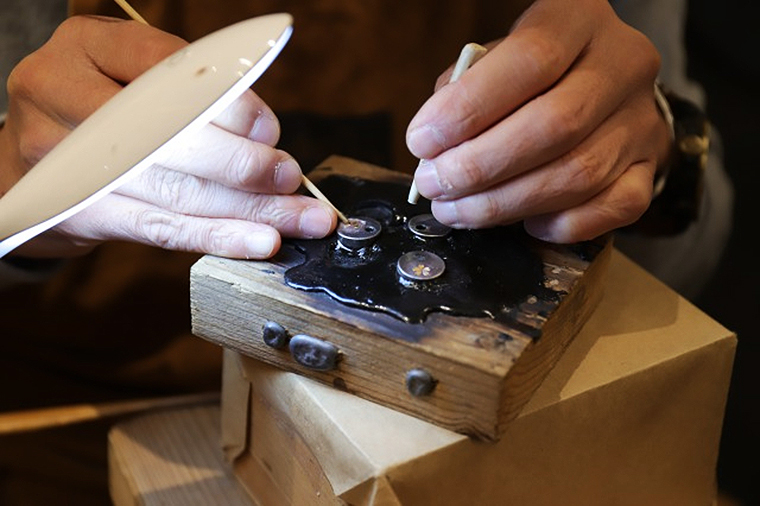 熊本・肥後象がん Standing Straight は、伝統工芸「肥後象がん」の、純金・純銀の板を黒地鉄の上にはめこむ「布目象嵌(ぬのめぞうがん)技法」を実演し、アクセサリーをつくっている。