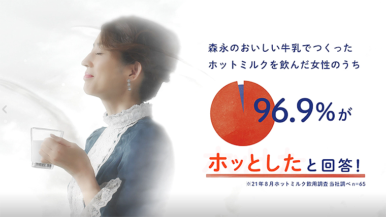 実は、調査の結果「森永のおいしい牛乳」でつくったホットミルクは、96.9%の人が「ホッとする」という。