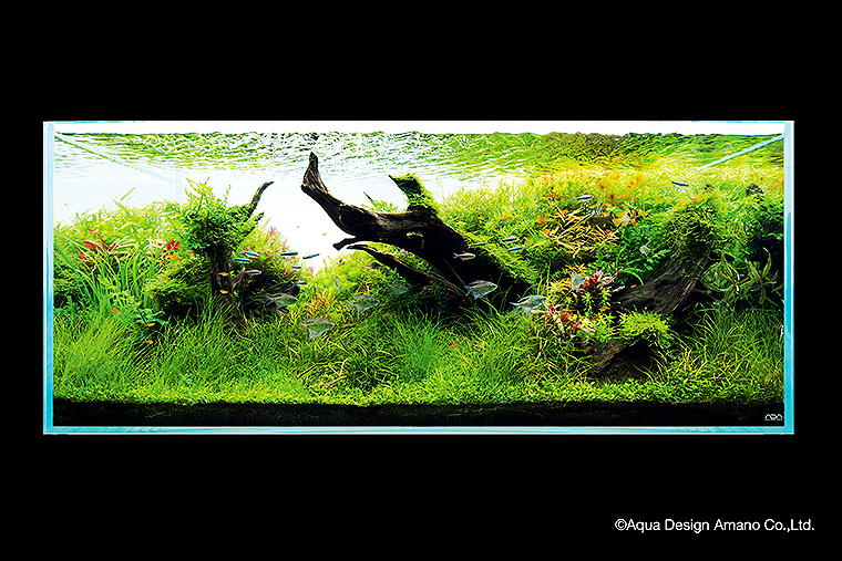 最長7mにもおよぶ「自然水景」の水槽では、いきもののほか、水草の植栽や石や流木で美しい自然環境の縮図を再現。