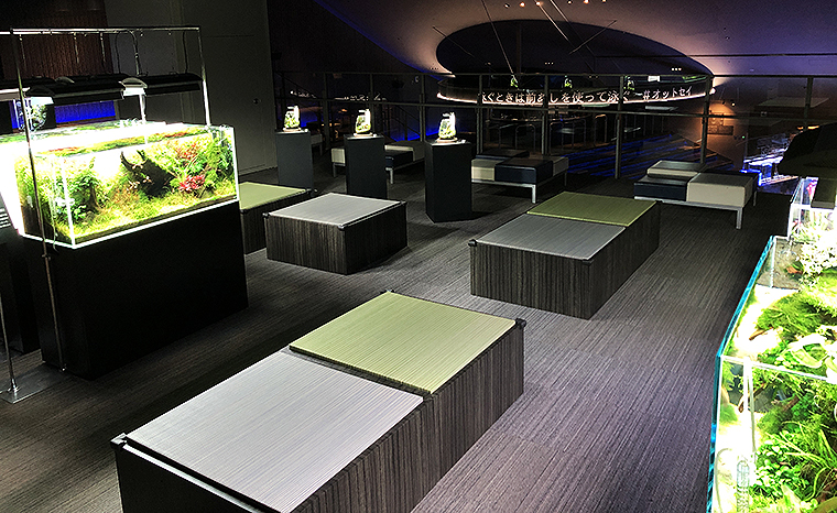 企画展「緑と呼吸のテラス」では、この「自然水景」をゆったりと体感できるよう、6つの企画水槽と複数の大型スツールを6階テラススペースに設置。