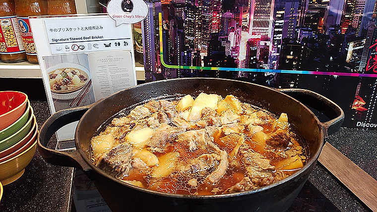 また、高貴な香りと華やかな味わいが特徴の玫瑰酒で味付けし、長時間じっくり煮込んでホロホロに仕上げたジューシーな「鶏の中華風醤油煮込み」や、八角や乾燥させたみかん、にんにく、青ねぎ、紹興酒などで絶妙なバランスに味付けをした「牛ばら肉と大根煮込み」。
