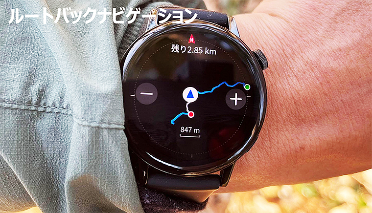 「そしてルートバック機能も優れている。登山ルートを記録し、同じルートを戻るシーンで、往路コースから外れると、アラートを出してくれる。これは便利で頼れる」