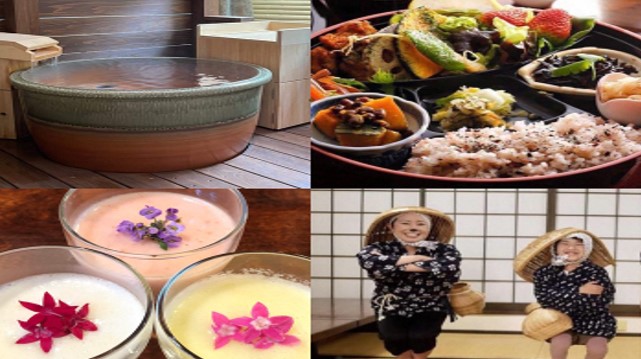 露天風呂付き貸切温泉に加え、お食事は地元食材をふんだんに使った健康美容食「マクロビオティック食」や、その日の体調に合わせて飲める「美肌ドリンク」も。