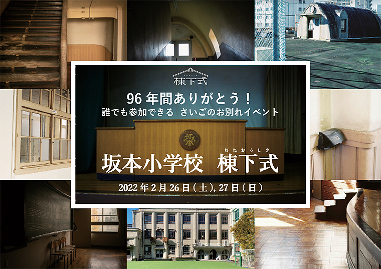 1926(大正15)年に誕生した「復興小学校」、大正・昭和の建築遺産ともいえる旧 坂本小学校が、3月に解体・撤去・更地化されるのを前に、誰でも無料で参加できるお別れ式「棟下式」を2月26・27日に開催する。