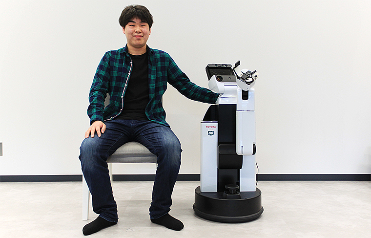 また、トヨタ自動車製ロボットHSRといっしょに並んで笑うのが、玉川大学 工学部 情報通信工学科 2年生 小林遼平さん。