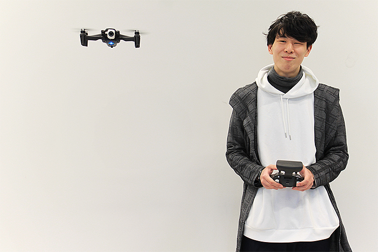 そして、得意のドローン操作で、ドローンをみごとピタリとホバリング(空中静止)させて笑うのが、玉川大学 工学部 情報通信工学科 1年生 仲戸川凱さん。