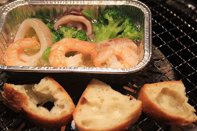 海老とイカのアヒージョ (490円 税込539円)は、キャンプ飯の定番「アヒージョ」を海老とイカの海鮮で焼肉きんぐ風に仕上げた品。バゲットに乗せて、熱々の魚介類を、ハフハフしながらどうぞ。