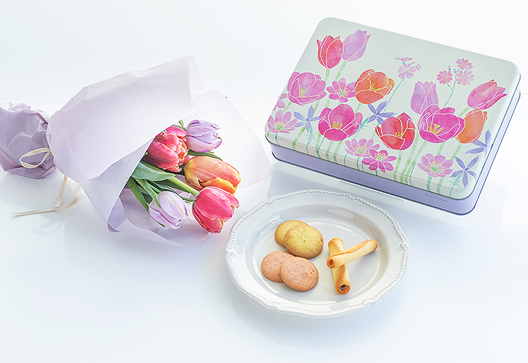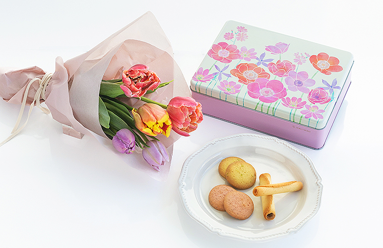 春のお花であるアネモネやチューリップを中心に描いたお菓子のパッケージをイメージし、ブーケにも春のお花を使用。チューリップには「思いやり」という花言葉があるように、贈る人の「思いやり」が贈られる人にも伝わるようなギフトに仕上げている。