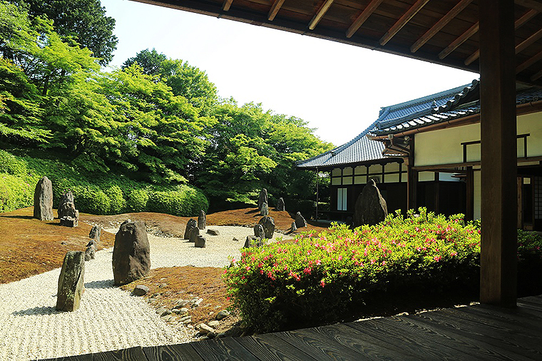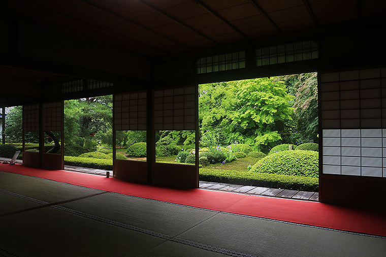 俳諧の祖とされる松永貞徳により作庭された「雪月花の三名園」のうち、比叡山を借景にした「雪の庭」を有する古刹。