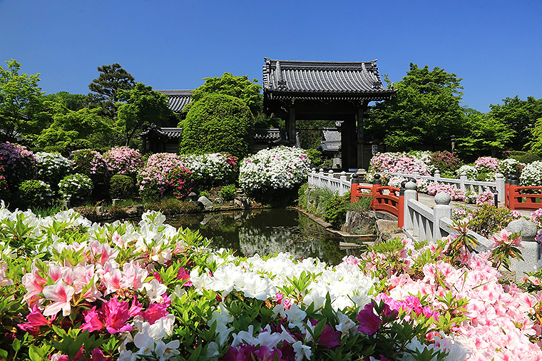 5月上旬から中旬にかけ、山門前に咲く3000株のツツジは圧巻。