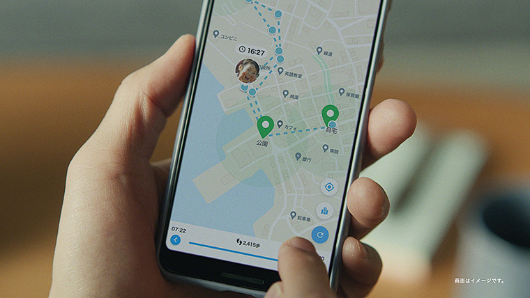 娘の渚ちゃんの小学校から家までの帰り道を、「みてねみまもりGPS」を通じて安心してみまもる父親が描かれている。