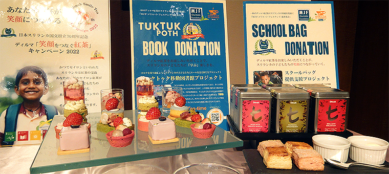 今回は、国内複数のホテルが賛同し、ホテルのアフタヌーンティーやデザートブッフェなどで提供される、ディルマ紅茶の売上による収益の一部を、スリランカの子どもたちの教育・学習の支援に活かしていく。