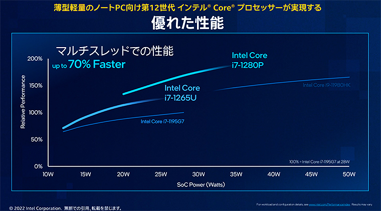 この薄型軽量のノートPCむけ第12世代インテルCoreプロセッサーは、超薄型ノートPCに「U-series 9W」が、モダンPCには「U-series 15W」が、ハイパフォーマンスPCには「P-series 28W」が組み込まれ、「本年中に250を超える第12世代インテルCoreプロセッサー搭載ノートブックPCが登場する」という。