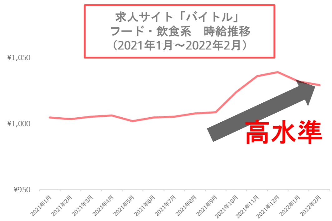 ディップが運営する「バイトル」の飲食系平均時給は1,029円と、緊急事態宣言が全国的に解除された昨年10月以降高い状態が続く。